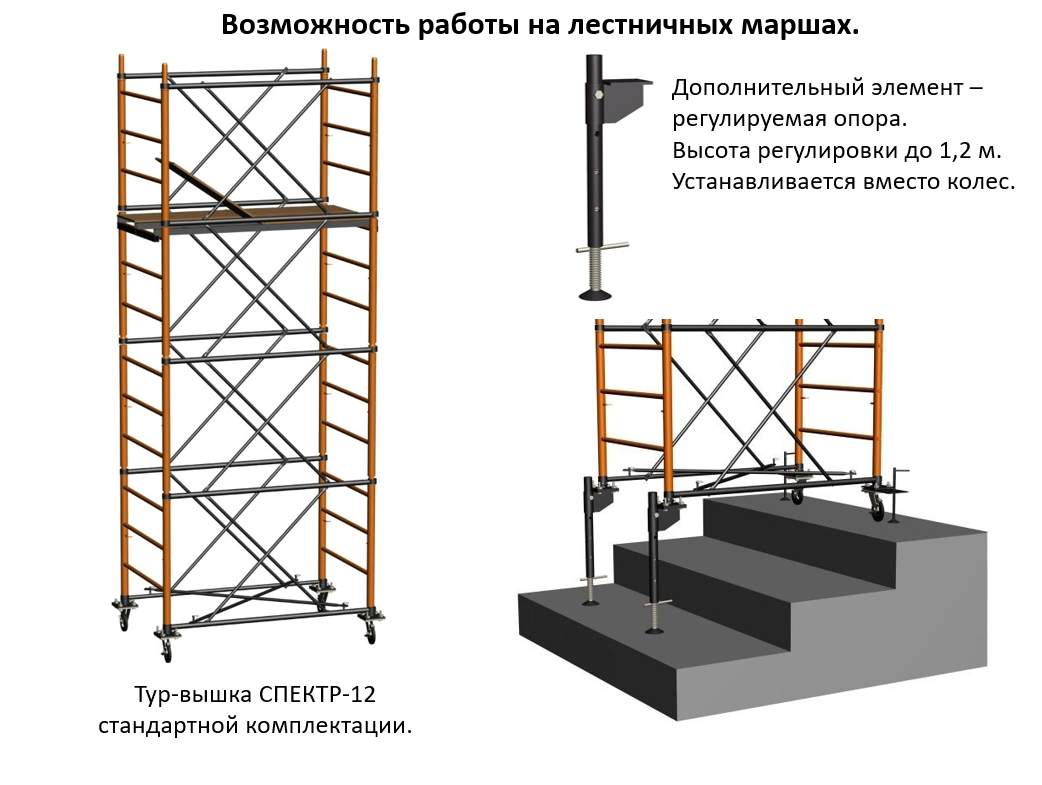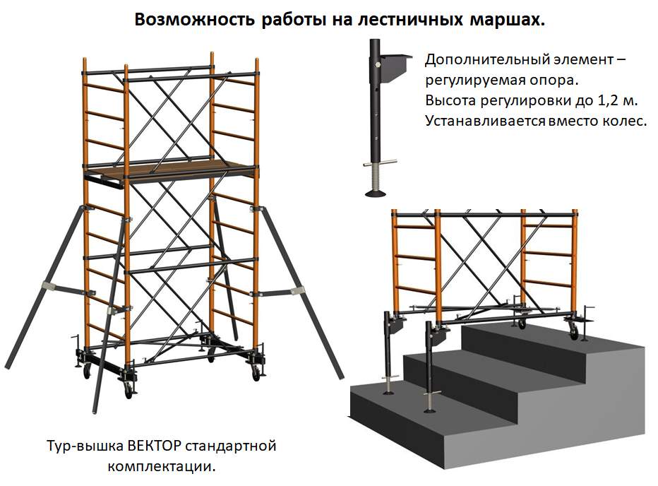 - Возможна доукомплектация специальными винтовыми опорами для работы на лестничных маршах или неровных поверхностях с возможностью регулировки до 1,2 м.